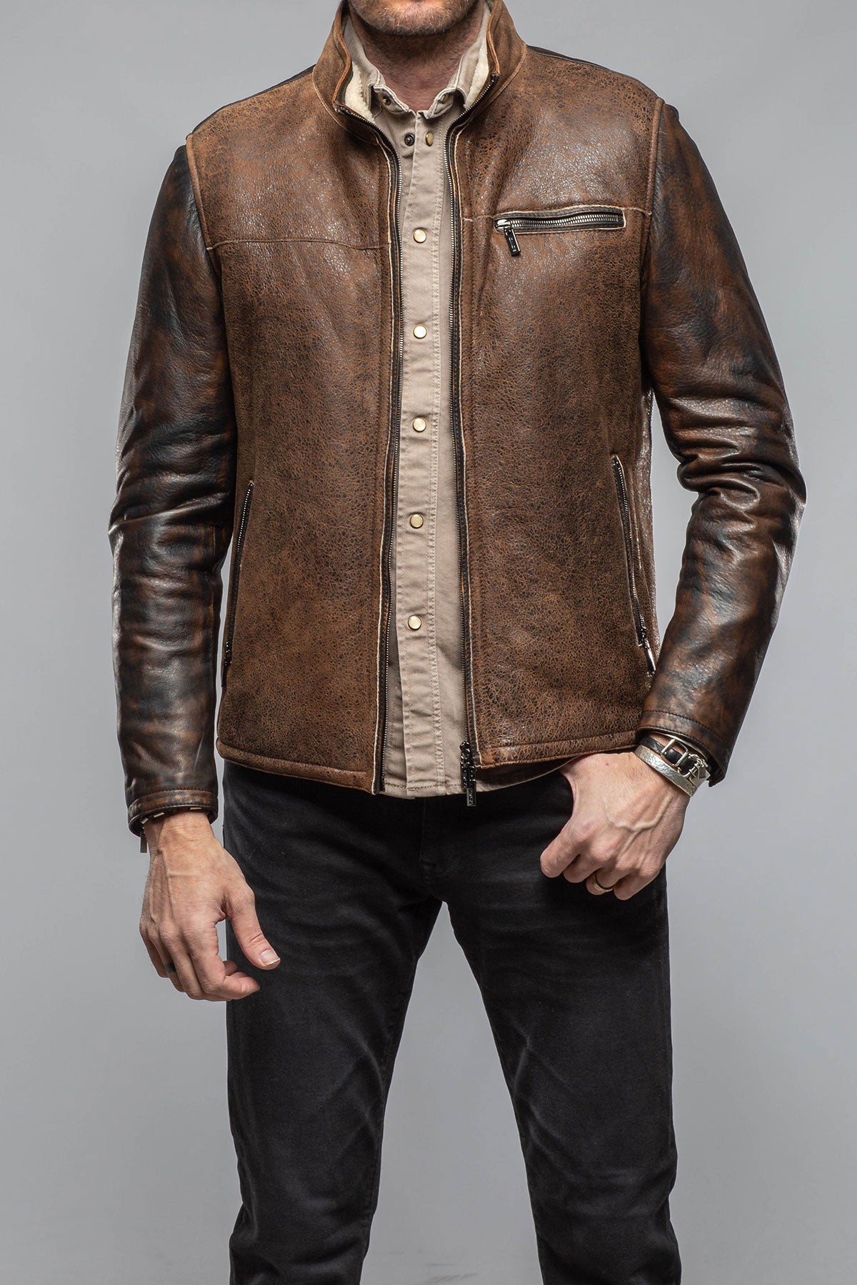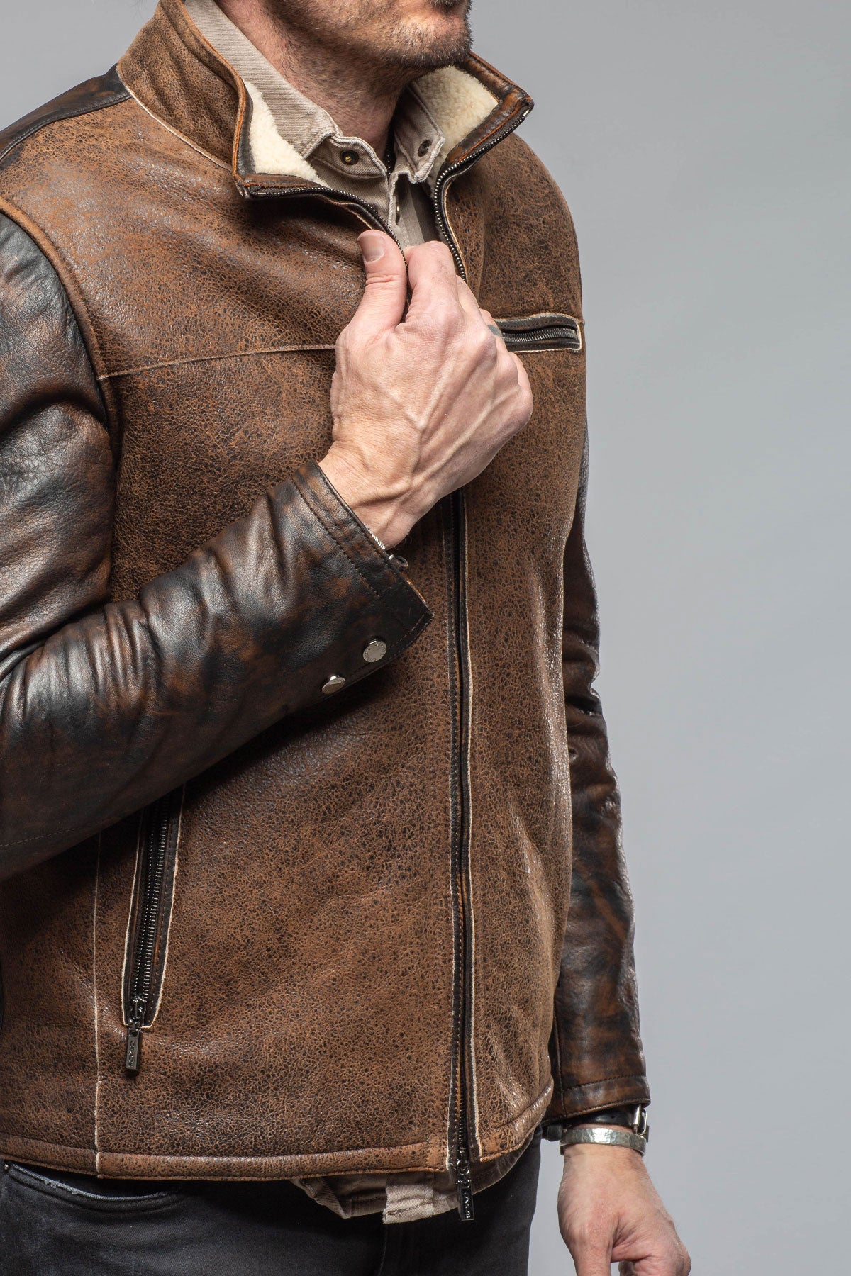 A blend of shearling front panels, with a napa leather back and sleeves, the Landon is a mid-weight shearling that serves as a three-season mountain jacket. A mix of town and country, sport and luxe.