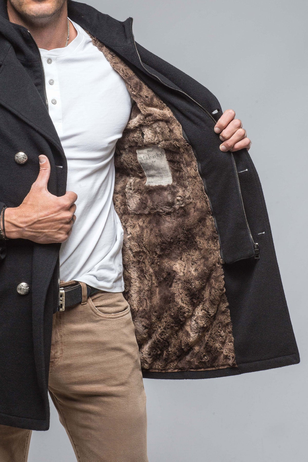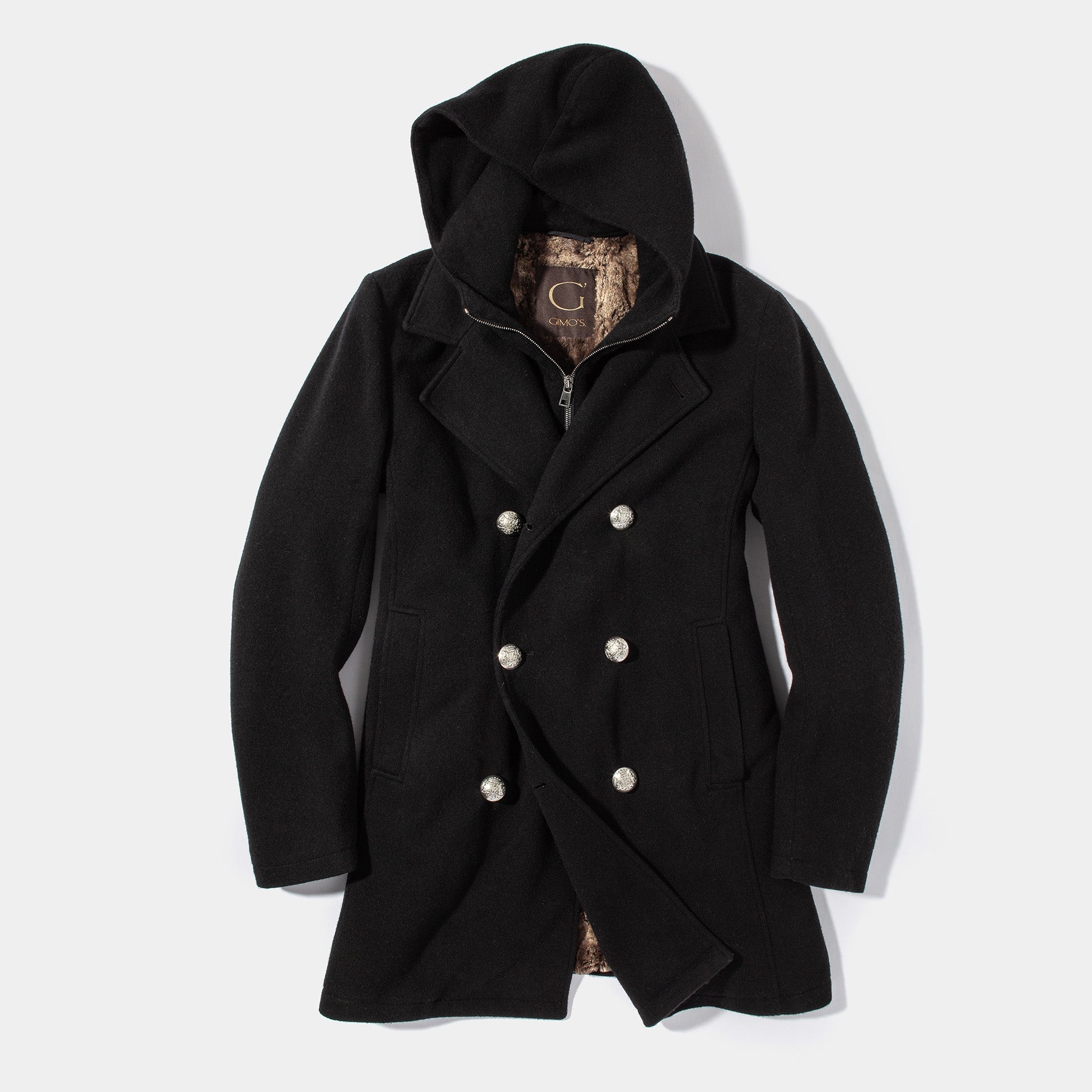 A modern minimalist take on the best-selling St. Christoff Jacket, the St. Lucca DB Jacket was made for Axel's by Gimo's of a luxurious woolen knit, then made even more dreamy with a plush interior lining. Clean lines and a sophisticated, well-tailored fit are at the forefront of the updated classic; smart-casual style points in the notch lapels, double-breasted styling, and removable hooded placket.